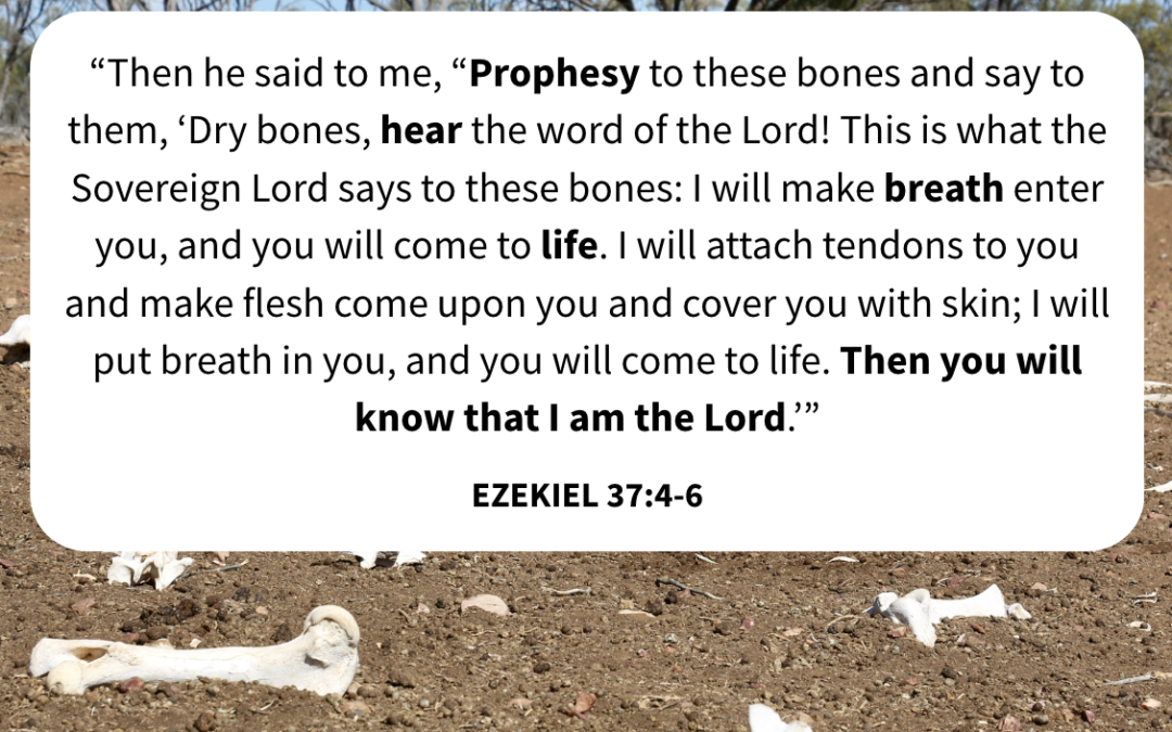 Ezekiel 37:4-6 “Then he said to me, “Prophesy to these bones and say to them, ‘Dry bones, hear the Word of the Lord! This is what the Sovereign Lord says to these bones: I will make breath enter you, and you will come to life. I will attach tendons to you and make flesh come upon you and cover you with skin; I will put breath in you, and you will come to life. Then you will know that I am the Lord.’”